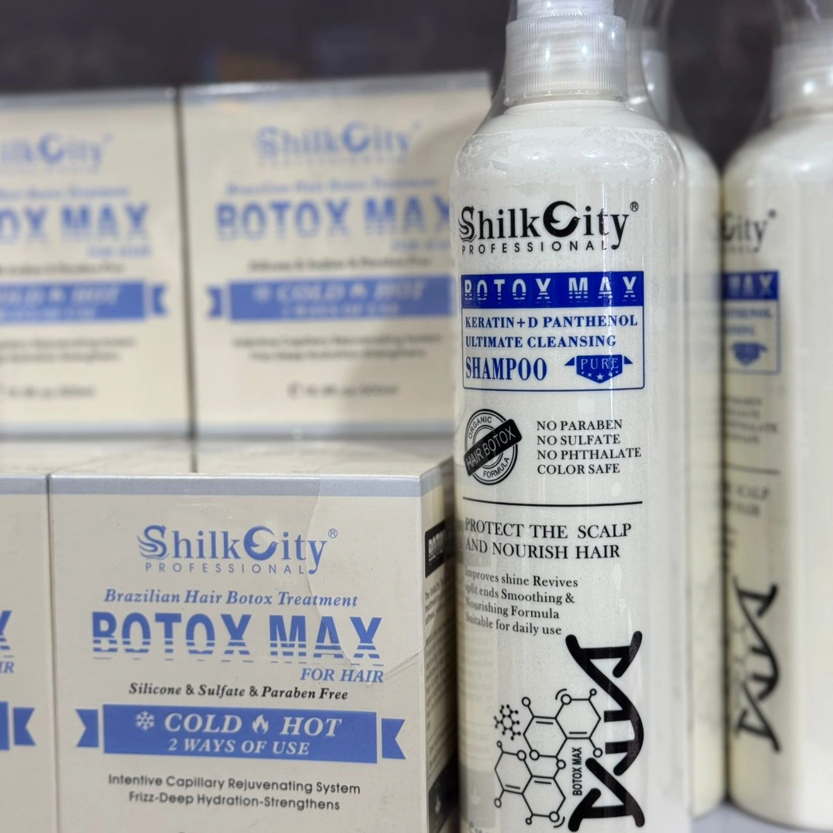 Silicone Free Parabean Free Sulphate free. Deep Hydration Strengthens. Shilky City Brazilian Hair Botox is the most modern form of formaldehyde-free treatment based on silk, keratin, collagen and quinoa proteins. Shields the hair’s defense against chemical and thermal work. Fights frizz giving hair volume, shine and elasticity.